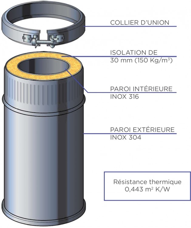 Nos éléments de longueur, également appelés éléments droits, pour conduit évacuation fumées double paroi isolé en acier inoxydable de très haute qualité avec le collier de serrage.