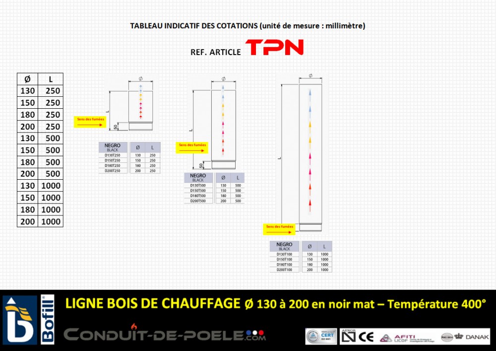 Tuyau fixe sans collier de serrage pour conduit évacuation fumées simple paroi noir Série "LIGNE BOIS DE CHAUFFAGE".